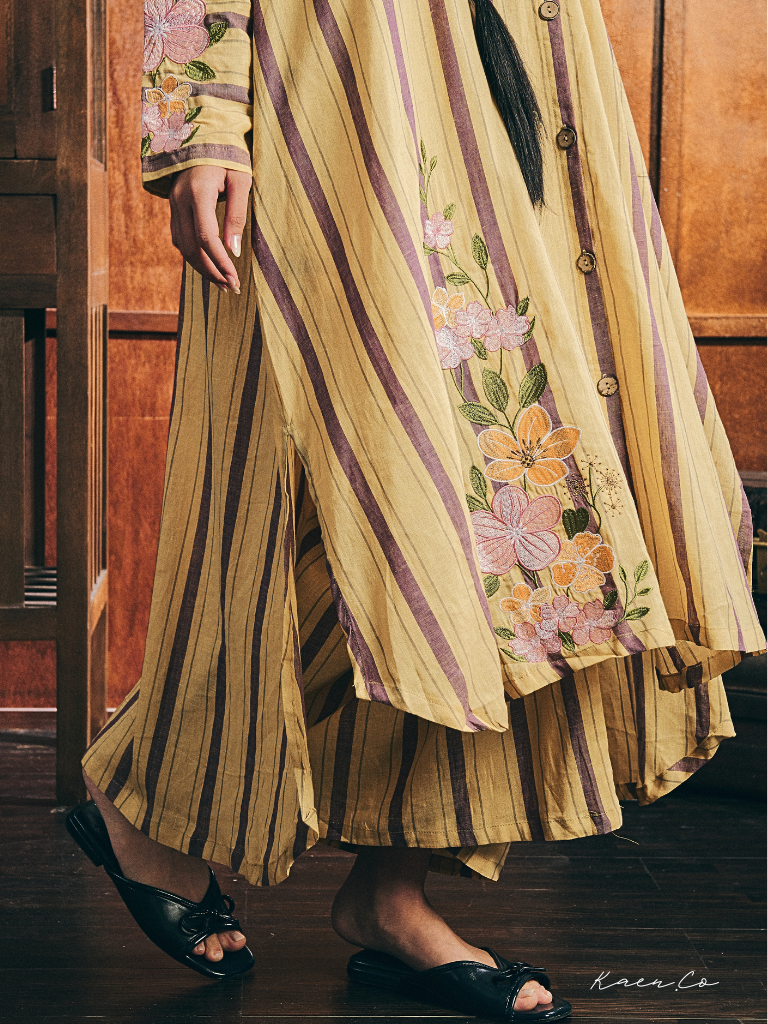 Crafted in breathable Linen fabric with subtle vertical stripes, this kebarung features a relaxed long cut paired with matching loose pants, allowing graceful movement without compromising comfort. Delicate floral embroidery along the sleeves and side panels adds a handcrafted touch, making each piece feel personal and refined.