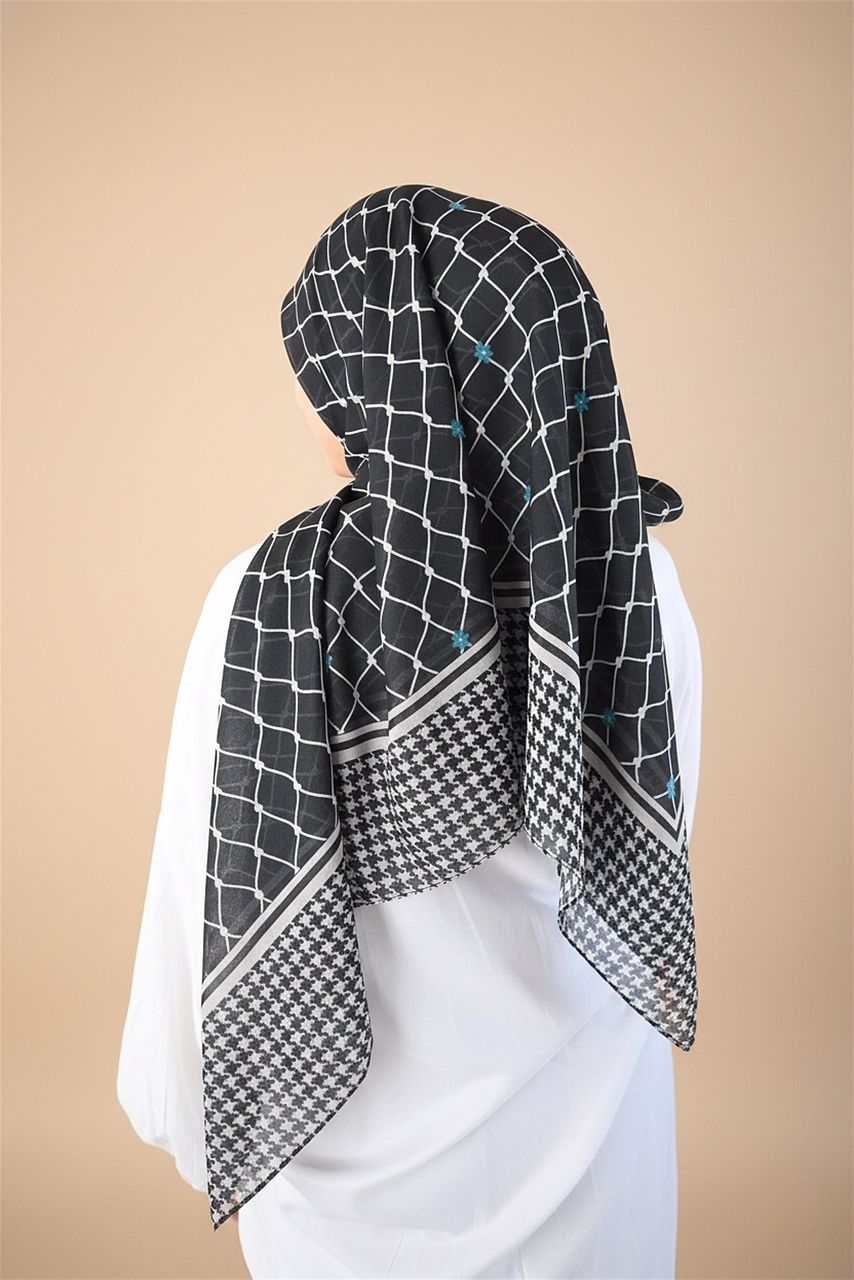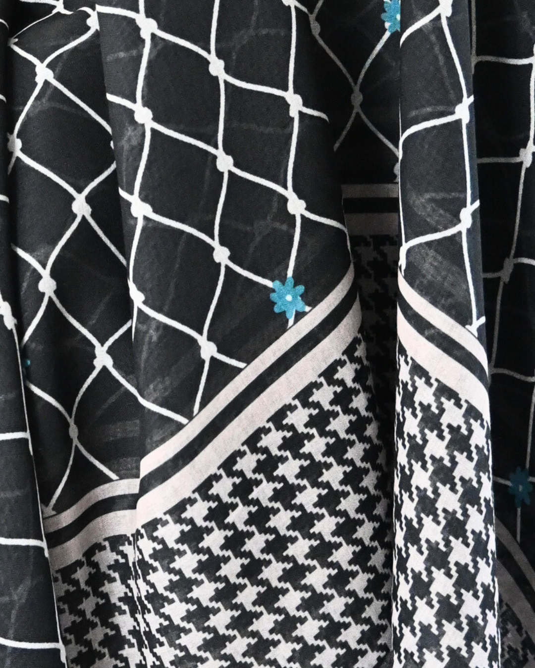 Inspired by the elegance of heritage textiles, the Kufiya Scarf brings together two timeless motifs — a delicate fish-net inspired grid and a refined houndstooth border. This unique blend creates a modern, structured look while still feeling soft, airy, and feminine.