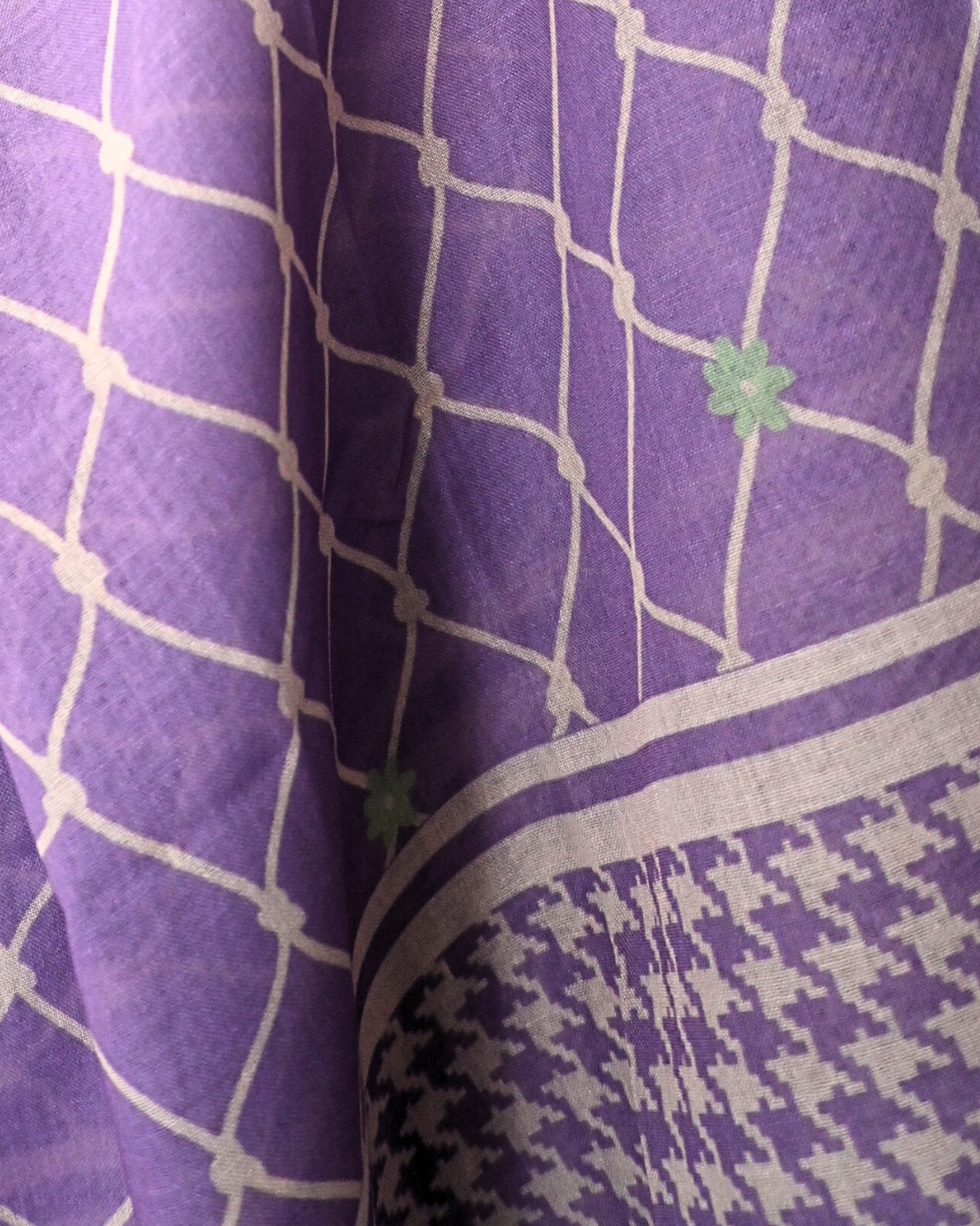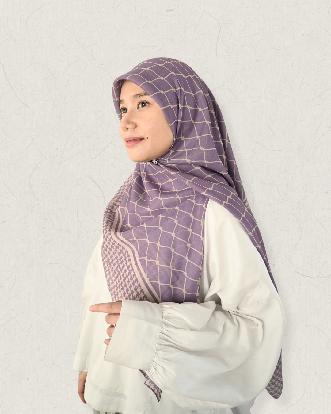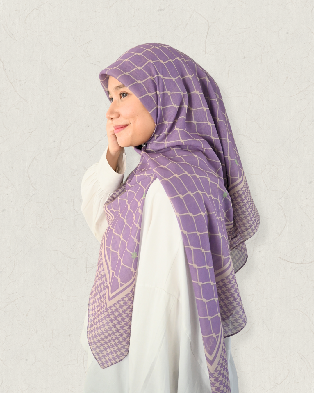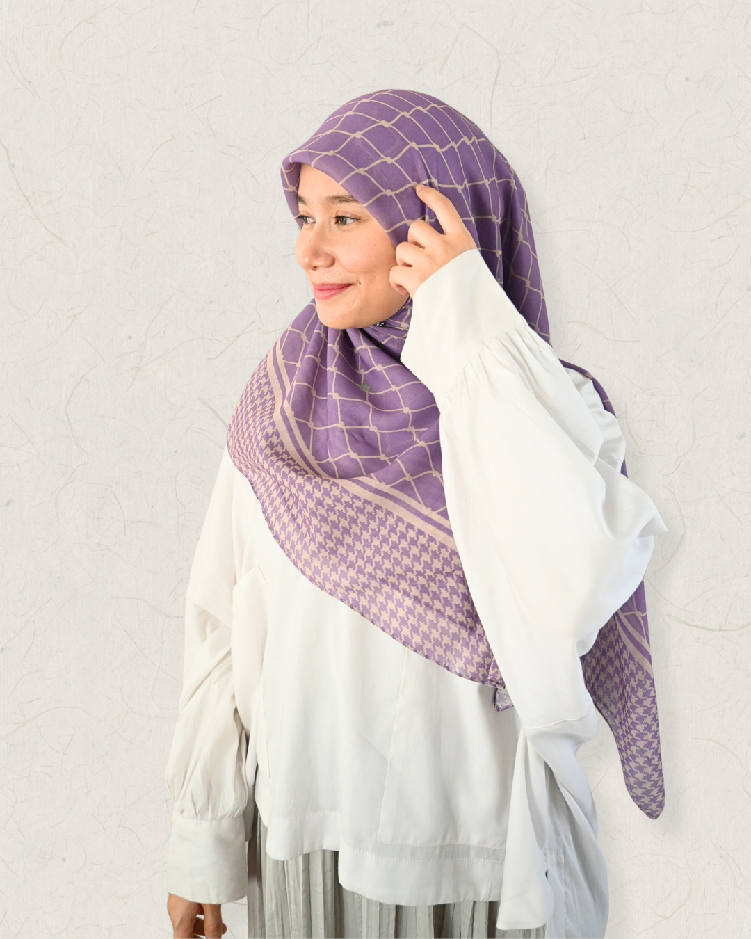 Inspired by the elegance of heritage textiles, the Kufiya Scarf brings together two timeless motifs — a delicate fish-net inspired grid and a refined houndstooth border. This unique blend creates a modern, structured look while still feeling soft, airy, and feminine.