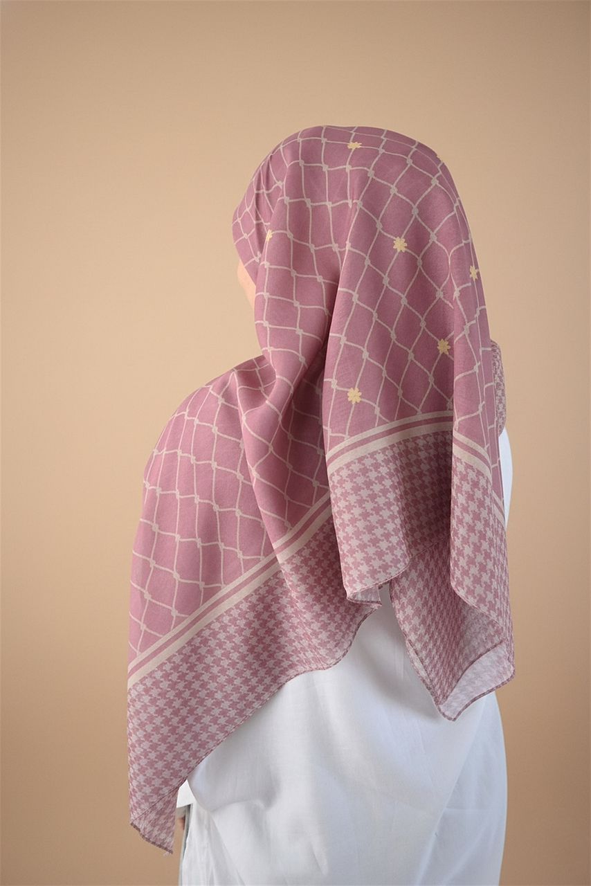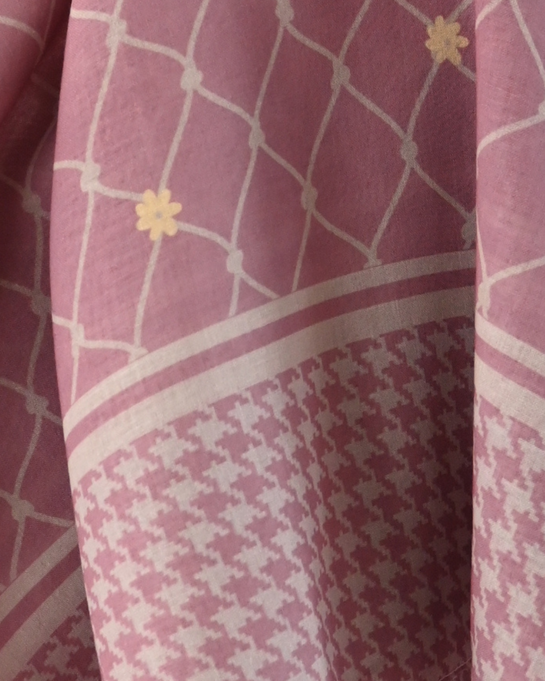 Inspired by the elegance of heritage textiles, the Kufiya Scarf brings together two timeless motifs — a delicate fish-net inspired grid and a refined houndstooth border. This unique blend creates a modern, structured look while still feeling soft, airy, and feminine.